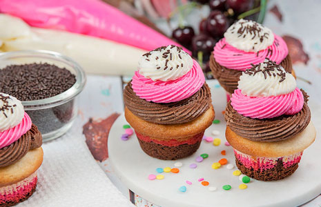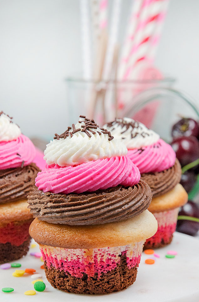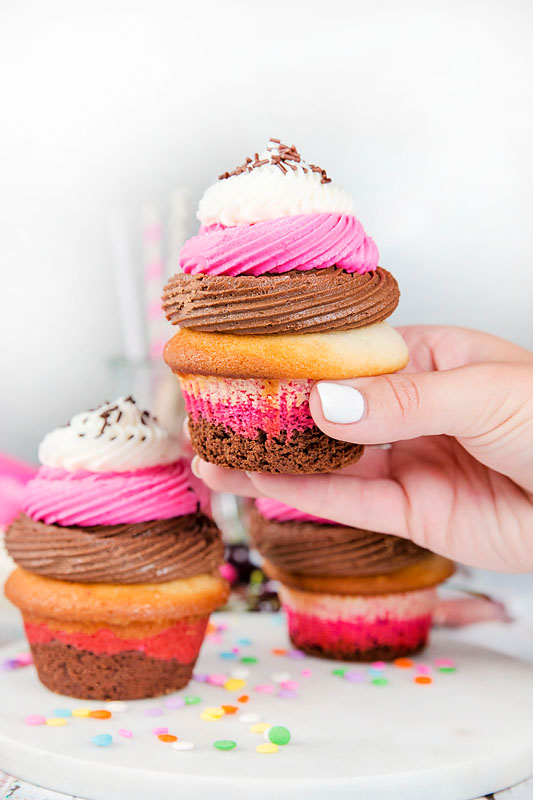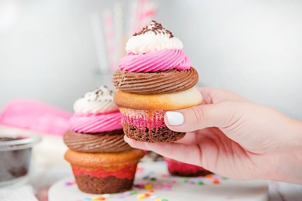 These neapolitan cupcakes are perfect for a special celebration and if you want you can even change up the colors to match your party decor. Plus, don’t forget to add some sprinkles. No cupcake is complete without them.
