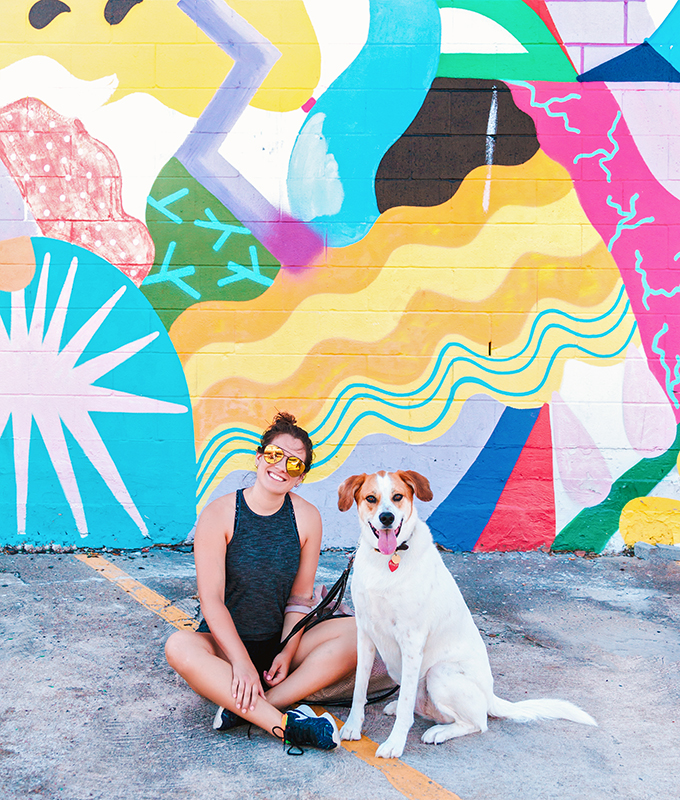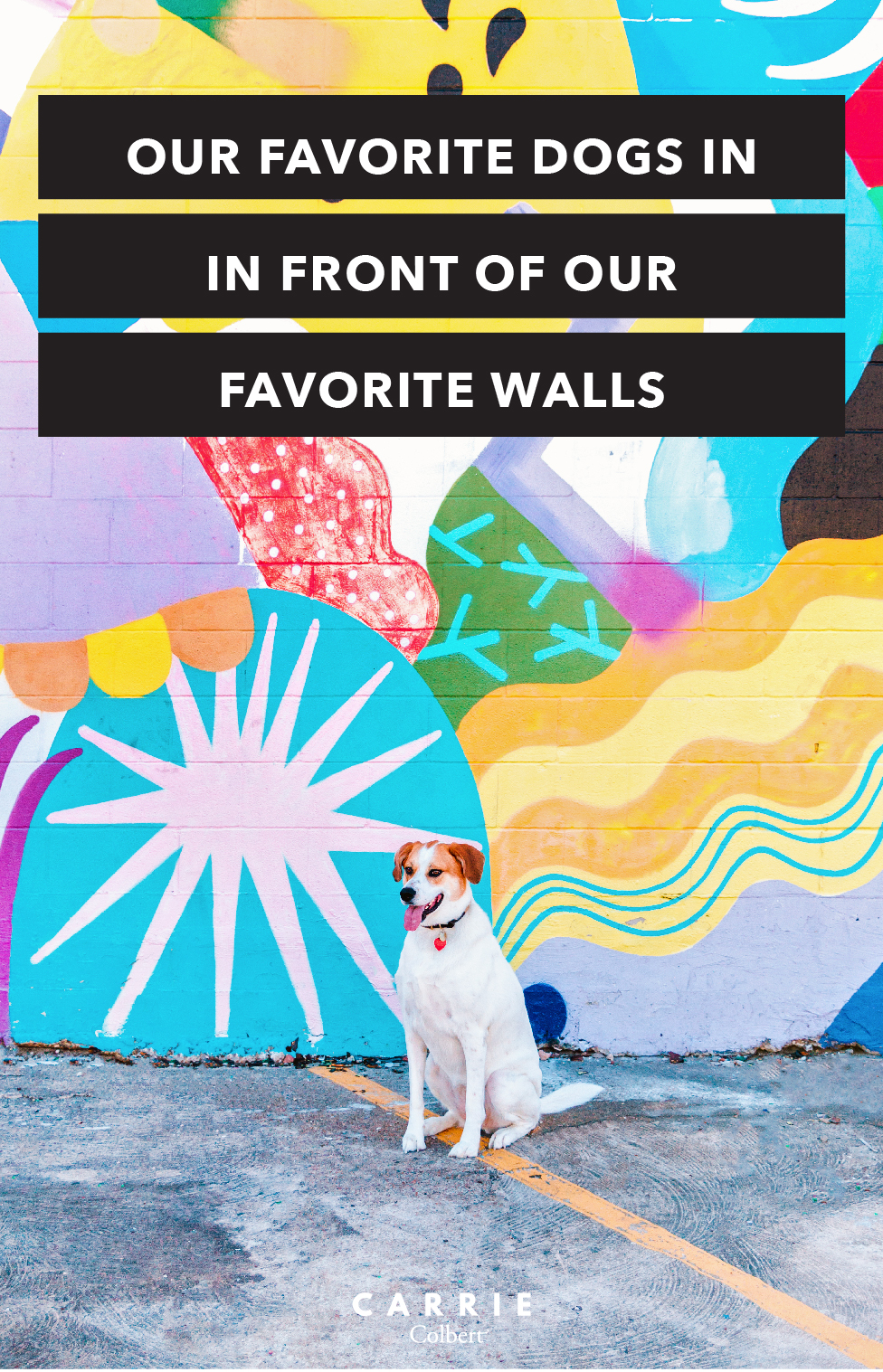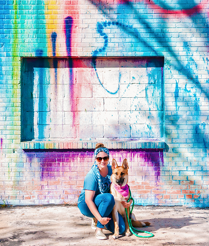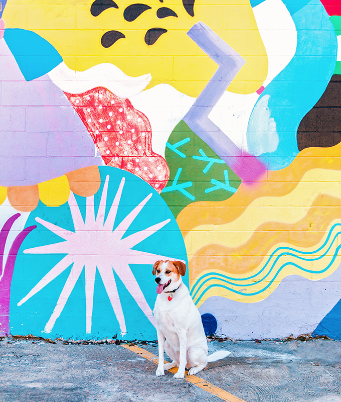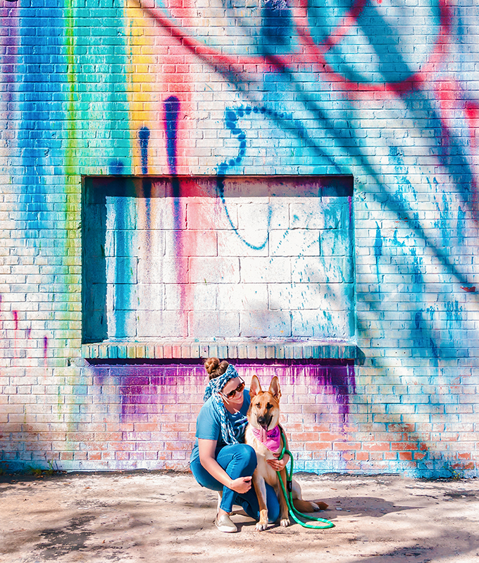 You know we love colorful walls – as evidenced by our mural guides. And we are particularly enamored by our hometown’s colorful walls. In fact, our Houston mural guide has grown to almost 100 walls! You know what else we love? Our dogs! Almost all of our team has a sweet pooch as part of their family. So, with National Dog Day approaching (it’s Sunday, August 26th, in case you’re curious), we were motivated to combine those to loves! Inspired by an Instagram account we love – @woofandwalls – we set out to photograph our favorite dogs and our favorite walls!