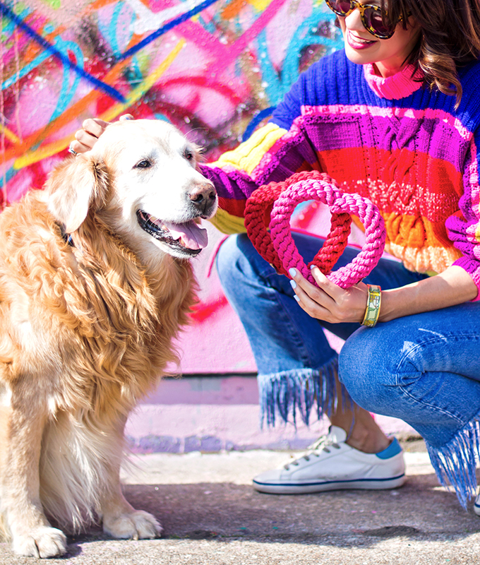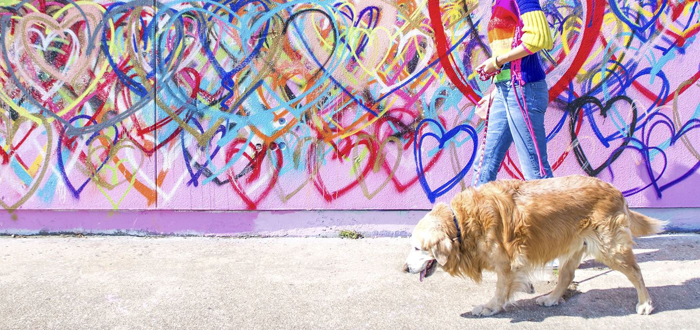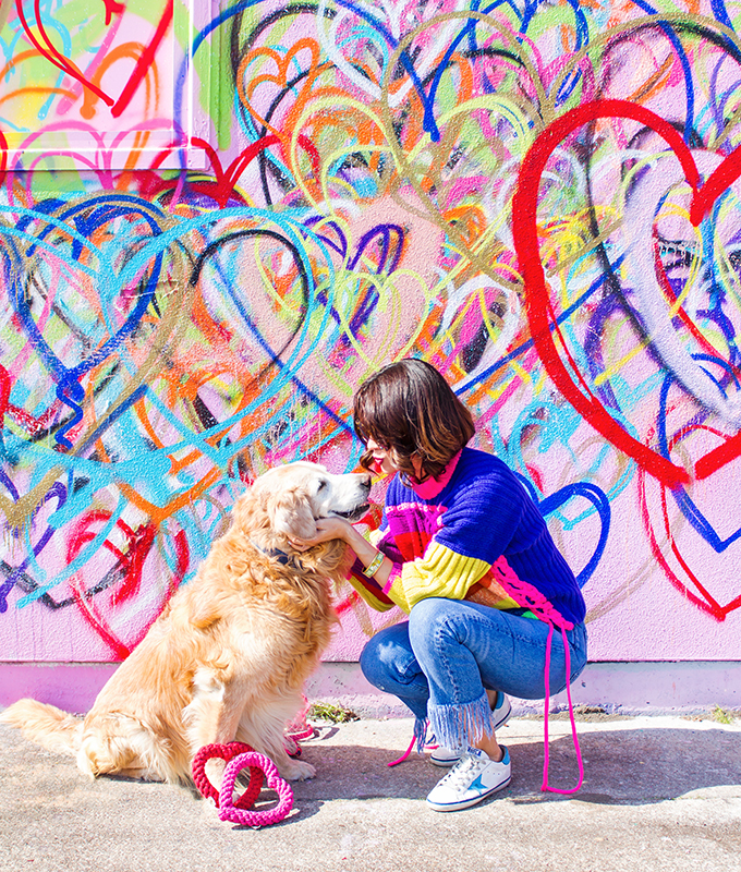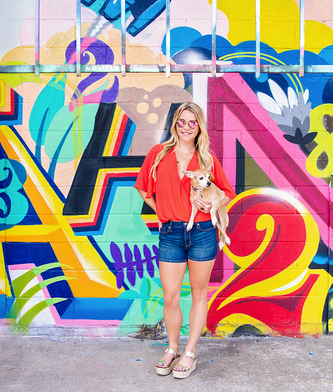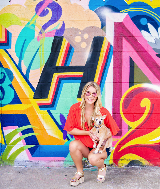 You know we love colorful walls – as evidenced by our mural guides. And we are particularly enamored by our hometown’s colorful walls. In fact, our Houston mural guide has grown to almost 100 walls! You know what else we love? Our dogs! Almost all of our team has a sweet pooch as part of their family. So, with National Dog Day approaching (it’s Sunday, August 26th, in case you’re curious), we were motivated to combine those to loves! Inspired by an Instagram account we love – @woofandwalls – we set out to photograph our favorite dogs and our favorite walls!