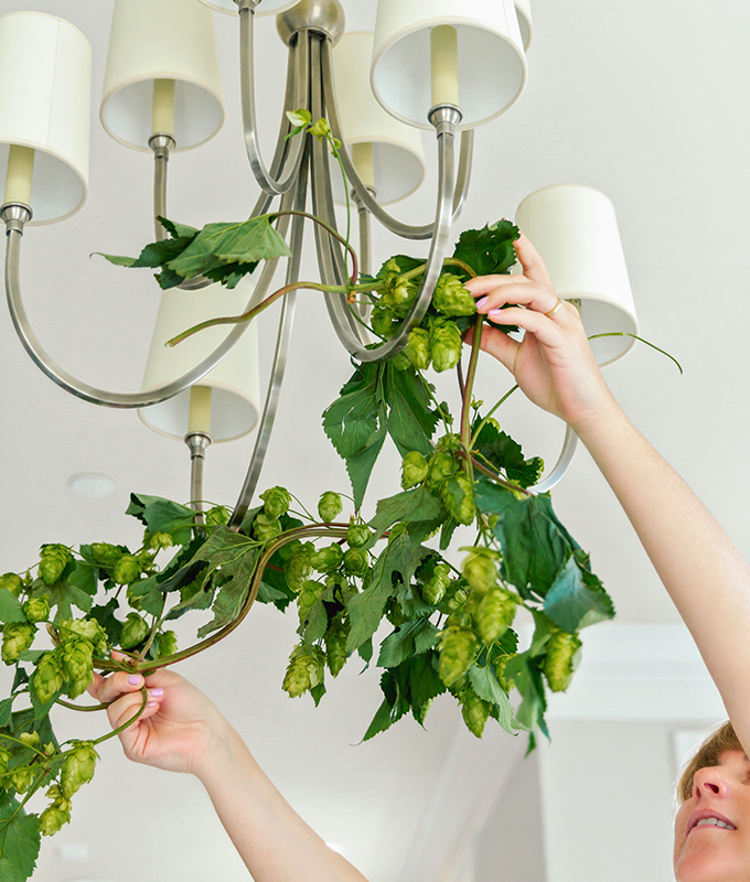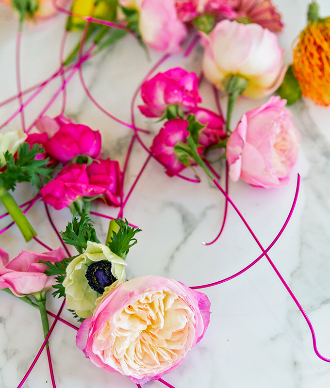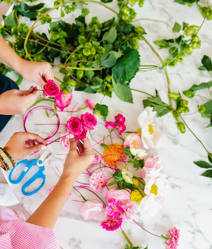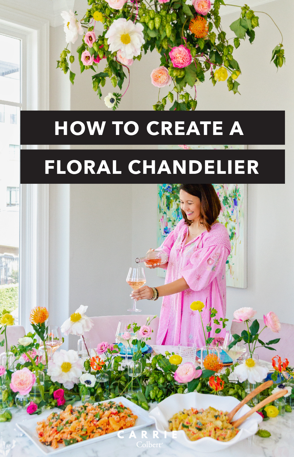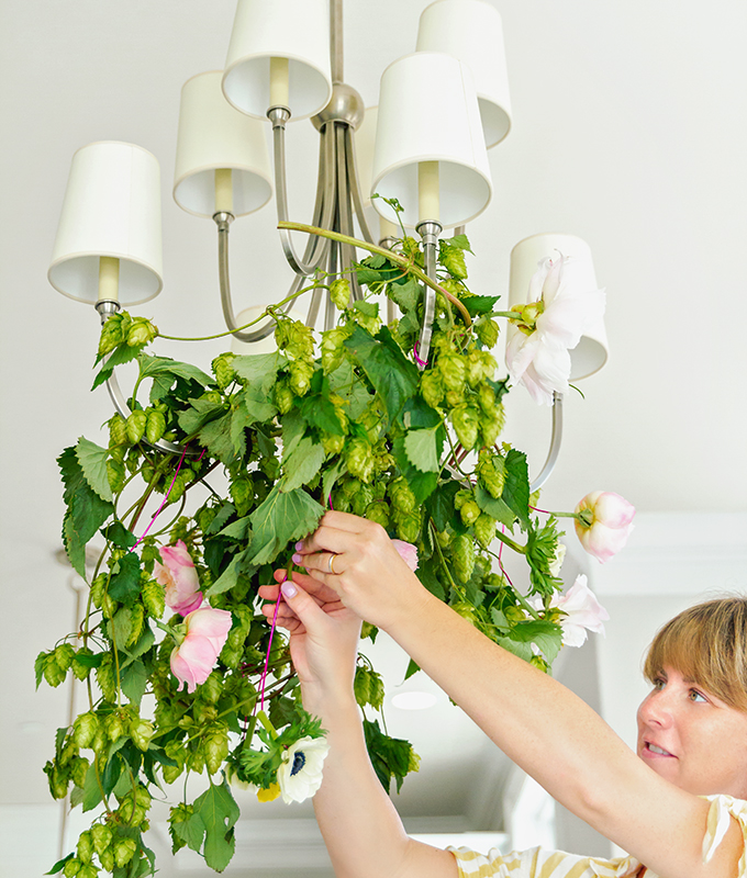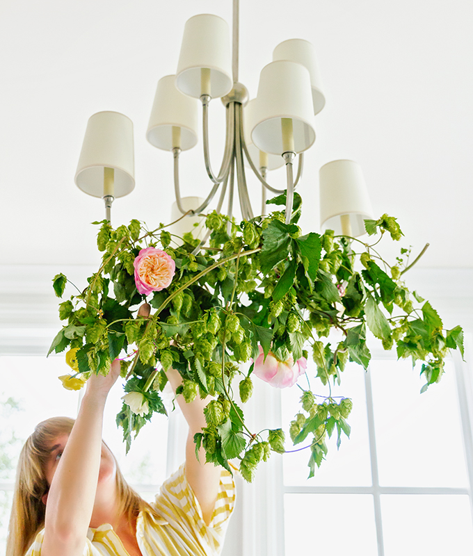So, we enlisted the help of our friend Holly of Flower Vibes for this project. And she did not disappoint! She brought all our visions of a floral chandelier to life in an easy to replicate by yourself at home manner.