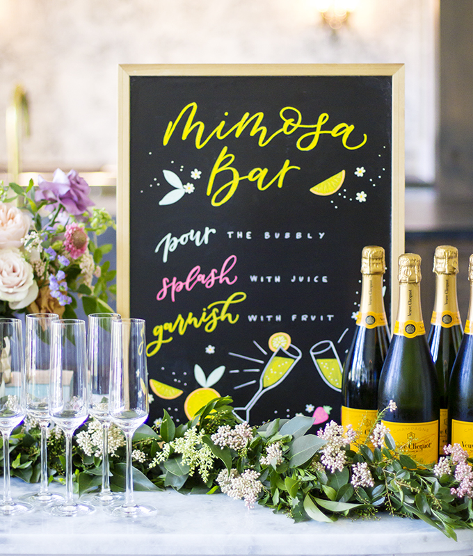 And don’t forget the signage! While a party invitation sets the tone for a party, themed signage continues to sing the melody of your party. Signage need not be complicated, but we can’t resist making things colorfully beautiful. So, we again enlisted Kristara to craft a mimosa bar sign. It simply states how to create your mimosa, while adding such a fun touch to the table.