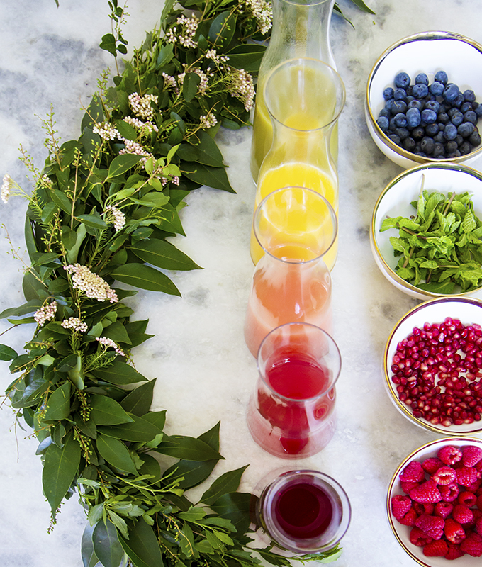 We ourselves offered not only orange juice, but also grapefruit, blood orange, cranberry, and honeydew. We might have chosen these based on their colors (are you surprised?), but they’re also deliciously refreshing and pair perfectly with champagne.