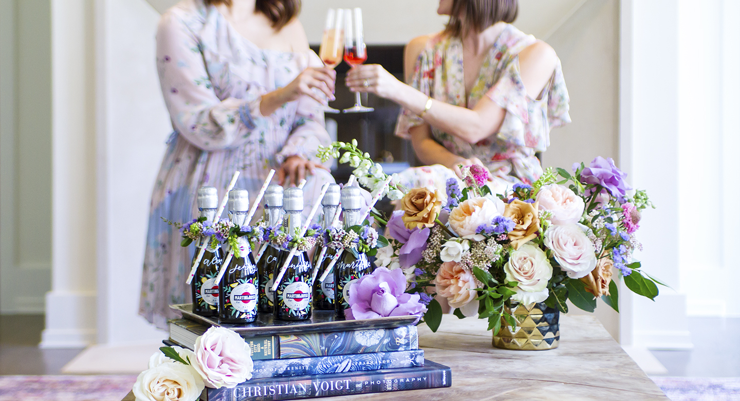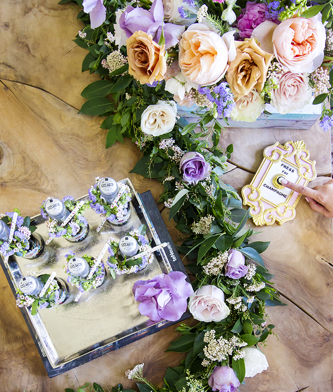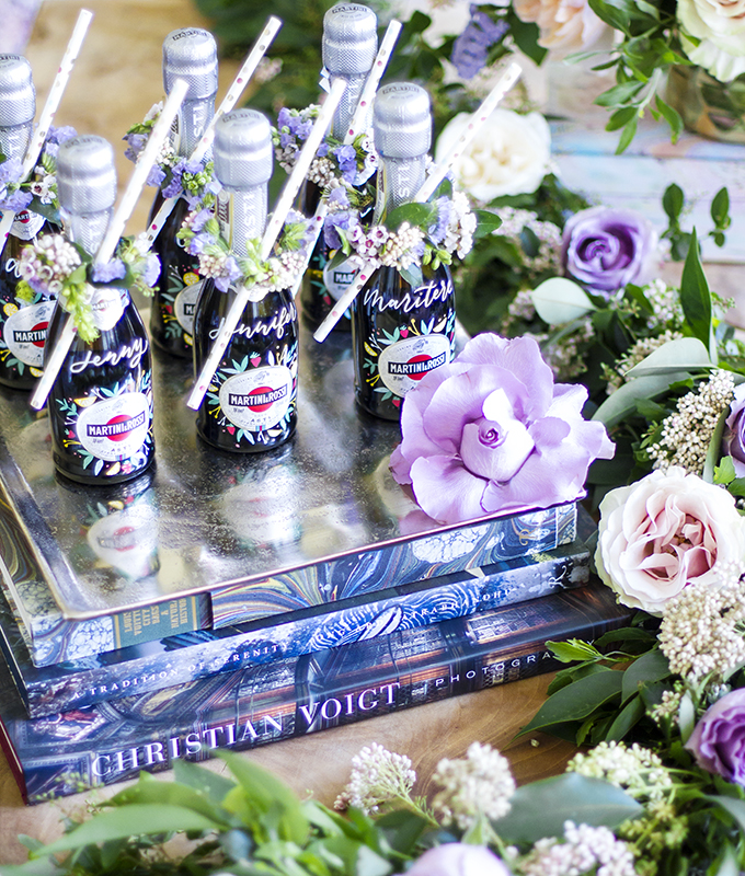 Now, if you’re hosting a party, don’t ever forget party favors! You always want to send your guests home with a little something special. And I think we certainly achieved that with these mini champagne bottles with flower crowns. Adorable, right? Each bottle was personalized with our guests’ names on them, courtesy of the super talented Kristara.