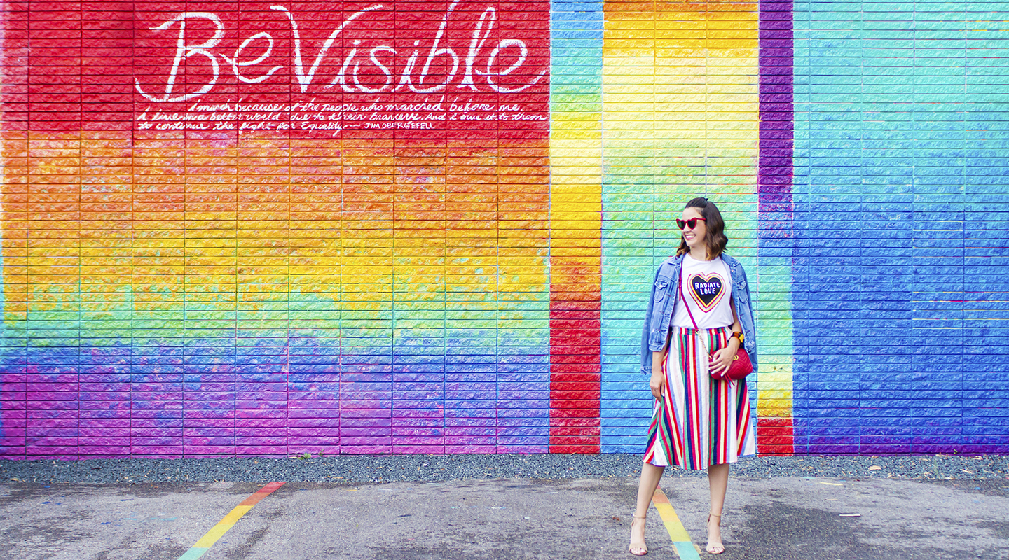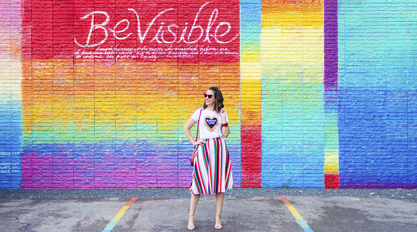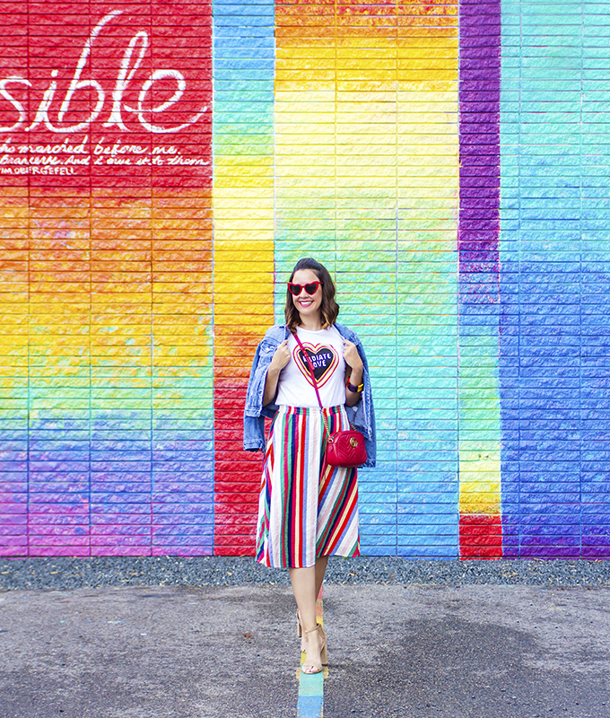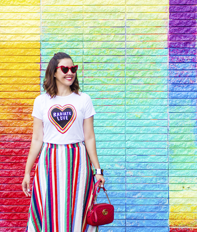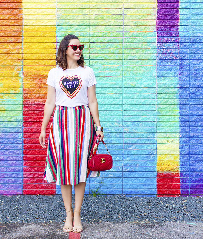 When I saw this t-shirt from ModCloth, I knew I needed to have it. Radiate love is such a powerful message and a great reminder always. And the fact that there is color quite literally radiating from the heart and message, it’s simply perfect. I immediately knew I wanted to pair it with a colorful striped skirt.