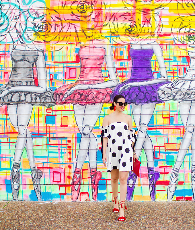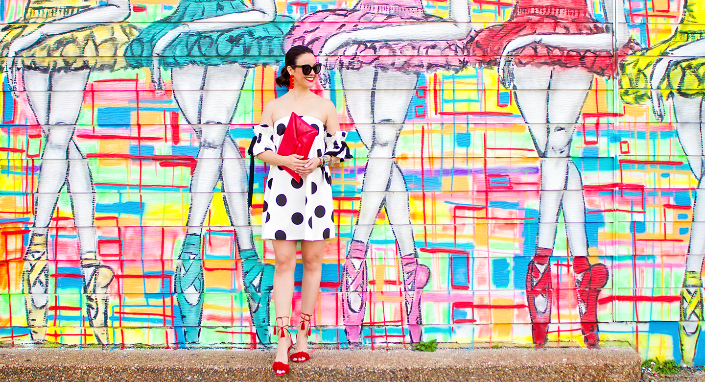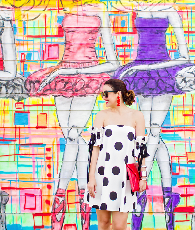 Obsessed with all this color! The red accents with the black and white polka dot dress is so creative and fun!!